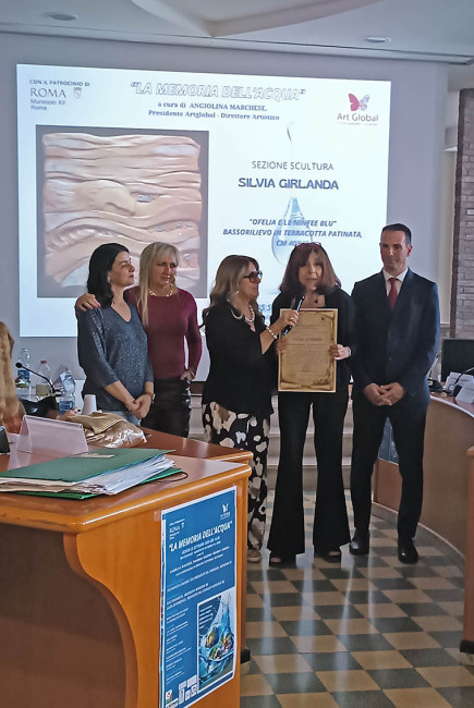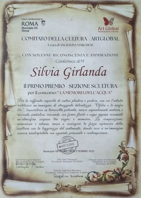 Il 25 settembre 2025 , nella Sala Conciliare del XII Municipio di Roma, ho avuto la grande soddisfazione di ricevere il 1° premio alla scultura per la mia opera in terracotta "Ofelia e le ninfee blu".