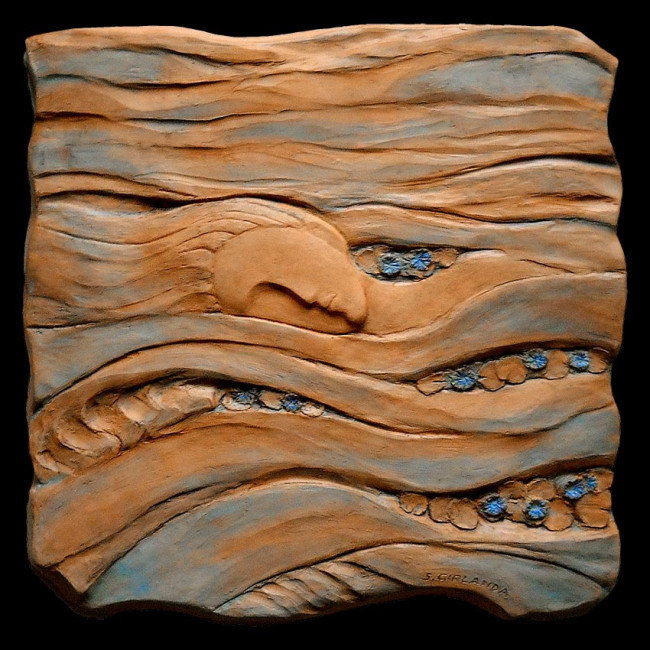 "Ofelia e le ninfee blu", questo è il titolo della mia terracotta, con cui ho voluto narrare la tragica storia di questo personaggio. Ofelia, nel dramma di Shakespeare "Amleto", devastata dal dolore per la morte del padre e dal rifiuto del principe Amleto, di cui è innamorata perdutamente, impazzisce, e inizia a vagare cantando e distribuendo fiori e ghirlande, finché cade in un fiume e annega. Le onde sembrano accogliere il suo corpo, lo cullano e lo trasportano dolcemente, circondandolo di profumate ninfee. Qui l'acqua non è fonte di vita, ma una sorta di viatico che accompagna la morte rendendola più dolce.
